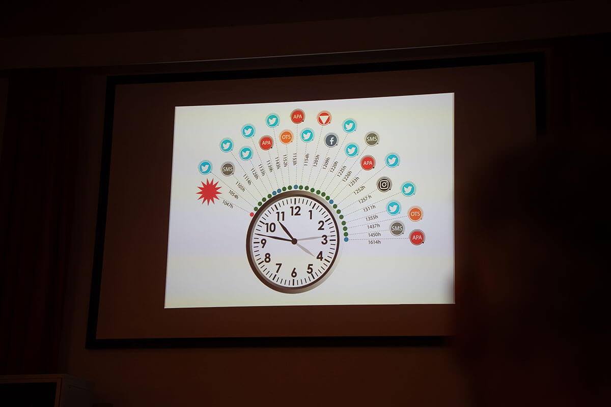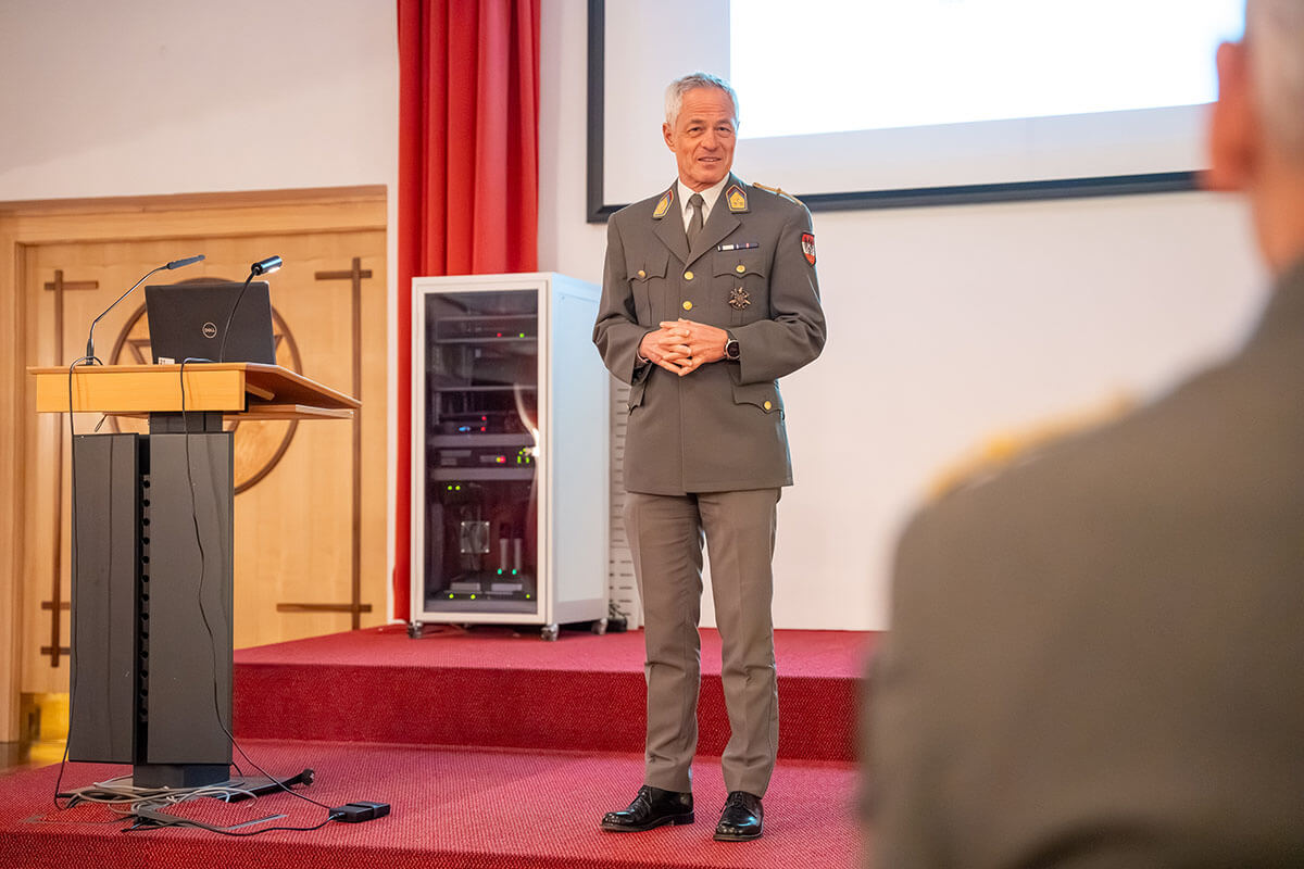 Es folgte die Begrüßung durch den Militärkommandanten Brigadier Mag. Peter Schinnerl in der Schwarzenberg-Kaserne, anschließend zeigte Oberst Mag. Michael Bauer, Pressesprecher des Bundesheeres, die Organisation seiner Abteilung und erklärte strukturierte Abläufe. Er veranschaulichte, wie Krisenkommunikation beim Bundesheer abläuft. Bauer betonte dabei als ersten Schritt die Wichtigkeit der Einordnung eines Vorfalls: „Nicht alles ist eine Krise. Man muss definieren, was eine Krise ist.“